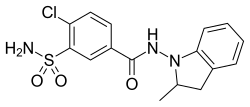 Indapamide is a thiazide-like diuretic[4] drug used in the treatment of hypertension, as well as decompensated heart failure. Combination preparations with perindopril (an ACE inhibitor antihypertensive) are available. The thiazide-like diuretics (indapamide and chlorthalidone) reduce risk of major cardiovascular events and heart failure in hypertensive patients compared with hydrochlorothiazide with a comparable incidence of adverse events.[5] Both thiazide diuretics and thiazide-like diuretics are effective in reducing risk of stroke.[5][6][7] Both drug classes appear to have comparable rates of adverse effects as other antihypertensives such as angiotensin II receptor blockers and dihydropyridine calcium channel blockers and lesser prevalence of side-effects when compared to ACE-inhibitors and non-dihydropyridine calcium channel blockers.[5][8]
