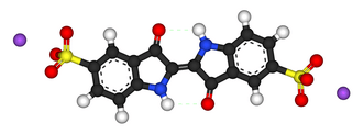 Indigo carmine, or 5,5′-indigodisulfonic acid sodium salt, is an organic salt derived from indigo by aromatic sulfonation, which renders the compound soluble in water. Like indigo, it produces a blue color, and is used in food and other consumables, cosmetics, and as a medical contrast agent and staining agent; it also acts as a pH indicator. It is approved for human consumption in the United States and European Union.[3][4] It has the E number E132, and is named Blue No. 2 by the US Federal Food, Drug, and Cosmetic Act.[5]