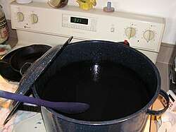 The precursor to indigo is indican, a colorless, water-soluble derivative of the amino acid tryptophan, and Indigofera leaves contain as much as 0.2–0.8% of this compound. Pressing cut leaves into a vat and soaking hydrolyzes the indican, releasing β-D-glucose and indoxyl. The indoxyl dimerizes in the mixture, and after 12–15 hours of fermentation yields the yellow, water-soluble leucoindigo. Subsequent exposure to air forms the blue, water-insoluble indigo dye.[7][8] The dye precipitates from the fermented leaf solution upon oxidation, but may also be precipitated when mixed with a strong base[9] such as lye. The solids are filtered, pressed into cakes, dried, and powdered. The powder is then mixed with various other substances to produce different shades of blue and purple.