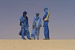 Throughout West Africa, Indigo was the foundation of centuries-old textile traditions. From the Tuareg nomads of the Sahara to Cameroon, clothes dyed with indigo signified wealth. Women dyed the cloth in most areas, with the Yoruba of Nigeria and the Mandinka of Mali particularly well known for their expertise. Among the Hausa male dyers, working at communal dye pits was the basis of the wealth of the ancient city of Kano, and they can still be seen plying their trade today at the same pits.[21] The Tuareg are sometimes called the "Blue People" because the indigo pigment in the cloth of their traditional robes and turbans stained their skin dark blue.[22]