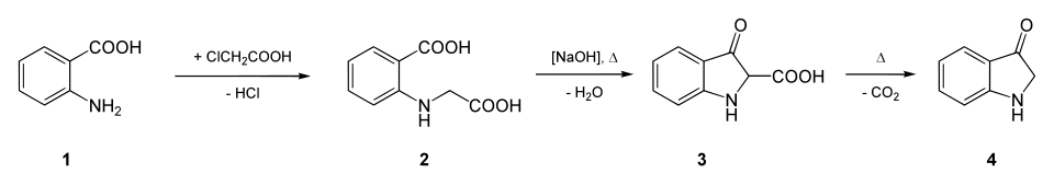 Indoxyl-Synthese: Anthanilic acid (1) reacts with chloroacetic acid to give phenylglycine-o-carboxylic acid. When treated in molten sodium carbonate, the 2-Indoxycarboxylic acid (3) decarboxylates to give indoxyl (4) .
