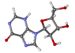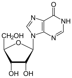 Inosine is a nucleoside that is formed when hypoxanthine is attached to a ribose ring (also known as a ribofuranose) via a β-N9-glycosidic bond. It was discovered in 1965 in analysis of RNA transferase.[1] Inosine is commonly found in tRNAs and is essential for proper translation of the genetic code in wobble base pairs.