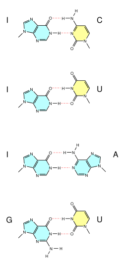 However, inosine pairs preferentially with cytosine (C) and its introduction to RNA, e.g. by the action of ADARs, thereby destabilizes double-stranded RNA by changing AU base-pairs to IU mismatches.[17]
