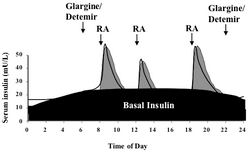 Diagram explaining the basal-bolus insulin schedule. The long acting insulin is given once (usually glargine, Lantus) or twice (usually detemir, Levemir) daily to provide a base, or basal insulin level. Rapid acting (RA) insulin is given before meals and snacks. A similar profile can be provided using an insulin pump where rapid acting insulin is given as the basal and premeal bolus insulin.