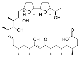 Ionomycin is an ionophore and an antibiotic that binds calcium ions (Ca2+) in a ratio 1:1. It is produced by the bacterium Streptomyces conglobatus.[3] It binds also other divalent cations like magnesium and cadmium, but binds Ca2+ preferably.[1][2]