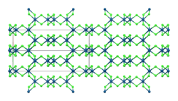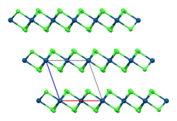 Like the related rhodium compound, IrCl3 adopts the structure seen for aluminium chloride.[6] This is the monoclinic α polymorph.[7] A rhombohedral β polymorph also exists. Both polymorphs have effectively the same anion lattice but differ in the octahedral interstices the iridium ions occupy.[8] The α polymorph converts to the β polymorph when heated to around 650 °C.[4]