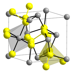 Iridium disulfide is the binary inorganic compound with the formula IrS2. Prepared by the direct reaction of the elements, the compound adopts the pyrite crystal structure at high pressure.[1] At normal atmospheric pressures, an orthorhombic polymorph is observed.[2]. The high- and low-pressure forms both feature octahedral Ir centers, but the S–S distances are pressure dependent.[3] Although not practical, IrS2 is a highly active catalyst for hydrodesulfurization.[4]