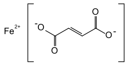 Iron(II) fumarate, also known as ferrous fumarate, is the iron(II) salt of fumaric acid, occurring as a reddish-orange powder, used to supplement iron intake. It has the chemical formula C4H2FeO4. Pure ferrous fumarate has an iron content of 32.87%, therefore one tablet of 300 mg iron fumarate will contain 98.6 mg of iron (548% Daily Value based on 18 mg RDI).