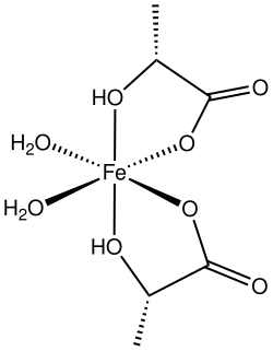 Ferrous lactate, or iron(II) lactate, are coordination complexes of iron(II) with one or more lactate ligands. One example is Fe(lactate)2(H2O)2(H2O) where lactate is CH3CH(OH)CO−2.[2] It is a colorless solid.
