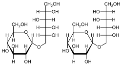 Isomalt is an equimolar mixture of two diastereomeric disaccharides: 1-O-α-D-glucopyranosido-D-mannitol (1,1-GPM) and 6-O-α-D-glucopyranosido-D-sorbitol (1,6-GPS). Each of these is composed of two sugars: glucose and mannitol in the case of 1,1-GPM and glucose and sorbitol (also known as glucitol) in the case of 1,6-GPS. Complete hydrolysis of isomalt yields glucose (50%), sorbitol (25%), and mannitol (25%).[1]