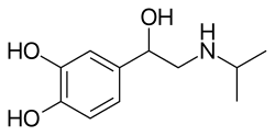 Side effects of isoprenaline include rapid heart beat, heart palpitations, and arrhythmias, among others.[9] Isoprenaline is a selective agonist of the β-adrenergic receptors, including both the β1- and β2-adrenergic receptors.[9] By activating these receptors, it increases heart rate and the force of heart contractions.[10] Chemically, isoprenaline is a synthetic catecholamine and is the N-isopropyl analogue of norepinephrine (noradrenaline) and epinephrine (adrenaline).[11][3][12][13]