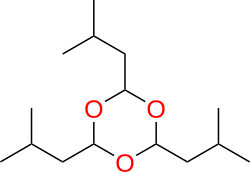 Acid-catalyzed cyclic trimerization of Isovaleraldehyde gives 2,4,6-Triisobutyl-1,3,5-trioxane [68165-40-2]. This is a flavouring agent that can be used in confectionary, tobacco, and other foodstuffs, toothpastes and the like.[8] It is described as imparting a creamy, dairy, vanilla chocolate and berry flavour.