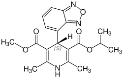Isradipine contains a stereocenter and consists of two enantiomers, more precisely atropisomers. This is a racemate, i.e. a 1: 1 mixture of (R)- and the (S)-forms:[7]