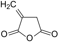 Itaconic anhydride is the cyclic anhydride of itaconic acid (an unsaturated, dicarboxylic acid) and is obtained by the pyrolysis of citric acid. It is a colourless, crystalline solid, which dissolves in many polar organic solvents and hydrolyzes forming itaconic acid.[4] Itaconic anhydride and its derivative itaconic acid have been promoted as biobased "platform chemicals" and bio- building blocks.[5][6]) These expectations, however, have not been fulfilled.[7]