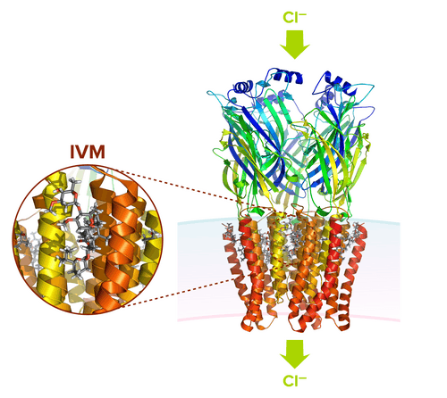 Ivermectin and its related drugs act by interfering with the nerve and muscle functions of helminths and insects.[62] The drug binds to glutamate-gated chloride channels common to invertebrate nerve and muscle cells.[71] The binding pushes the channels open, which increases the flow of chloride ions and hyper-polarizes the cell membranes,[62] paralyzing and killing the invertebrate.[71] Ivermectin is safe for mammals (at the normal therapeutic doses used to cure parasite infections) because mammalian glutamate-gated chloride channels only occur in the brain and spinal cord: the causative avermectins usually do not cross the blood–brain barrier, and are unlikely to bind to other mammalian ligand-gated channels.[71]