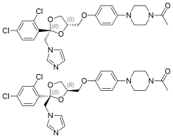 ![]() (2R,4S)-(+)-ketoconazole (top) (2S,4R)-(−)-ketoconazole (bottom) | |