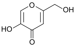 Kojic acid is an organic compound with the formula HOCH2C5H2O2OH. It is a derivative of 4-pyrone that functions in nature as a chelation agent produced by several species of fungus, especially Aspergillus oryzae, which has the Japanese common name koji.[2][3][4] Kojic acid is a by-product in the fermentation process of malting rice, for use in the manufacturing of sake, the Japanese rice wine.[2] It is a mild inhibitor of the formation of pigment in plant and animal tissues, and is used in food and cosmetics to preserve or change colors of substances.[5] It forms a bright red complex with ferric ions.[6]