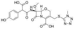 - ^ Narisada M, Yoshida T, Onoue H, Ohtani M, Okada T, Tsuji T, et al. (July 1979). "Synthetic studies on β-lactam antibiotics. Part 10. Synthesis of 7β-[2-carboxy-2-(4-hydroxyphenyl)acetamido]-7.alpha.-methoxy-3-[[(1-methyl-1H-tetrazol-5-yl)thio]methyl]-1-oxa-1-dethia-3-cephem-4-carboxylic acid disodium salt (6059-S) and its related 1-oxacephems". Journal of Medicinal Chemistry. 22 (7): 757–759. doi:10.1021/jm00193a001. PMID 448673.