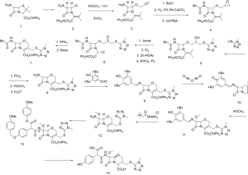 The benzhydrol ester of 6-Aminopenicillanic acid (6-APA) is S-chlorinated and treated with base whereupon the intermediate sulfenyl chloride fragments (to 2). Next, displacement with propargyl alcohol in the presence of zinc chloride gives predominantly the stereochemistry represented by diastereoisomer 3. The side chain is protected as the phenylacetylamide; the triple bond is partially reduced with a 5% Pd-CaCO3 (Lindlar catalyst) and then epoxidized with mCPBA to give 4. The epoxide is opened at the least hindered end with 1-methyl-1H-tetrazole-5-thiol to put in place the future C-3 side chain and give intermediate 5. Jones oxidation followed in turn by ozonolysis (reductive work-up with zinc-AcOH) and reaction with SOCl2 and pyridine give halide 6. The stage is now wet for intramolecular Wittig reaction. Displacement with PPh3 and Wittig olefination gives 1-oxacephem 7. Next a sequence is undertaken of side chain exchange and introduction of a 7-methoxyl group analogous to that which is present in cephamycins and gives them the enhanced beta-lactamase stability. First 7 is converted to the imino chloride with PCl5 and then to the imino methyl ether (with methanol) and next hydrolyzed to the free amine (8). Imine formation with 3,5-di-t-butyl-4-hydroxybenzaldehyde is next carried out leading to 9. Oxidation with nickel(III) oxide gives iminoquinone methide 10, to which methanol is added in a conjugate sense and in the stereochemistry represented by formula 11. The imine is exchanged with Girard's reagent T to give 12, and this is acylated by a suitable protected arylmalonate, as the hemiester hemiacid chloride so as to give 11. Deblocking with aluminium chloride and anisole gives moxalactam 14.