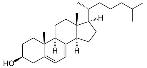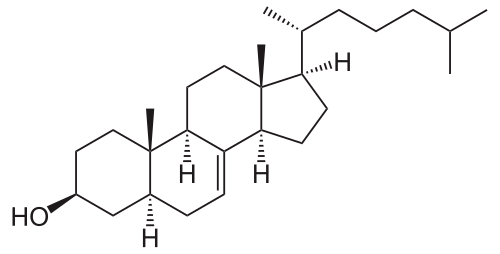 Lathosterol is a cholesterol-like molecule found small amounts in humans.[1] The enzyme Δ7-sterol 5(6)-desaturase converts it to 7-dehydrocholesterol. It is accumulated in lathosterolosis.[2]