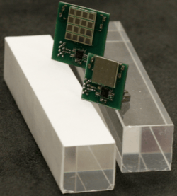 2 crystals in conjunction with silicon photomultipliers. High energy charged particles create Cerenkov light as they pass through the crystals, which is measured by the silicon photomultipliers.[7][8]