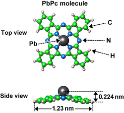 Lead(II) Phthalocyanine (PbPc), also known as phthalocyanine lead, is a salt consisting of a lead ion and Pc2−, the conjugate base of pythalocyanine. It is a organolead dye and bright purple powder.[1][2] It's also used as a near infared light absorber for photodetectors.[3] It has a unique structural feature which is called and resembles a "shuttle cock."[3]