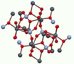 Structure of PbCrO4 as determined by X-ray crystallography. Color code: red = O, dark gray = Pb, light gray = Cr.