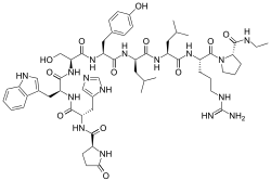 The peptide sequence is Pyr-His-Trp-Ser-Tyr-D-Leu-Leu-Arg-Pro-NHEt (Pyr = L-pyroglutamyl).