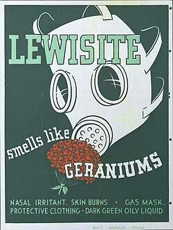 Lewisite (L) (A-243) is an organoarsenic compound. It was once manufactured in the United States, Japan, Germany[2] and the Soviet Union[3] for use as a chemical weapon, acting as a vesicant (blister agent) and lung irritant. Although colorless and odorless in its pure form, impure samples of lewisite are a yellow, brown, violet-black, green, or amber oily liquid with a distinctive odor that has been described as similar to geraniums.[4][5][6]