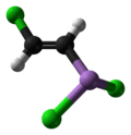 Lewisite can be a mixture of molecules with a different number of vinylchloride groups on the arsenic chloride: lewisite itself (2-chlorovinylarsonous dichloride), along with bis(2-chlorovinyl)arsinous chloride (lewisite 2) and tris(2-chlorovinyl)arsine (lewisite 3).[13] In addition, there are sometimes isomeric impurities: lewisite itself is mostly trans-2-chlorovinylarsonous dichloride, but the cis stereoisomer and the constitutional isomer (1-chlorovinylarsonous dichloride) may also be present.[14]