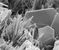 SEM image of fractured hardened cement paste, showing plates of calcium hydroxide and needles of ettringite (micron scale)