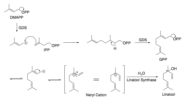 Linalool biosynthesis pathway. Abbreviations used: geranyl diphosphate synthase (GDS), pyrophosphate ester (OPP), isopentenyl pyrophosphate (IPP), dimethylallyl pyrophosphate (DMAPP), geranyl pyrophosphate (GPP). Stereogenic centers are indicated by an asterisk.
