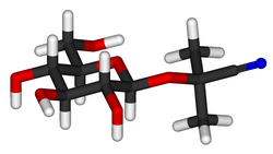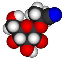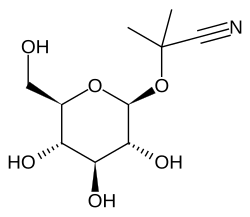Linamarin is a cyanogenic glucoside found in the leaves and roots of plants such as cassava, lima beans, and flax. It is a glucoside of acetone cyanohydrin. Upon exposure to enzymes and gut flora in the human intestine, linamarin and its methylated relative lotaustralin can decompose to the toxic chemical hydrogen cyanide; hence food uses of plants that contain significant quantities of linamarin require extensive preparation and detoxification. Ingested and absorbed linamarin is rapidly excreted in the urine and the glucoside itself does not appear to be acutely toxic. Consumption of cassava products with low levels of linamarin is widespread in the low-land tropics. Ingestion of food prepared from insufficiently processed cassava roots with high linamarin levels has been associated with dietary toxicity, particularly with the upper motor neuron disease known as konzo to the African populations in which it was first described by Trolli and later through the research network initiated by Hans Rosling. However, the toxicity is believed to be induced by ingestion of acetone cyanohydrin, the breakdown product of linamarin.[2] Dietary exposure to linamarin has also been reported as a risk factor in developing glucose intolerance and diabetes, although studies in experimental animals have been inconsistent in reproducing this effect[3][4] and may indicate that the primary effect is in aggravating existing conditions rather than inducing diabetes on its own.[4][5]