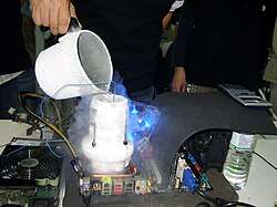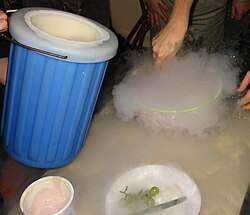 The culinary use of liquid nitrogen is mentioned in an 1890 recipe book titled Fancy Ices authored by Agnes Marshall.[13] It has been employed in more recent times by restaurants in the preparation of frozen desserts, such as ice cream, which can be created within moments at the table because of the speed at which it cools food.[13] The rapidity of chilling also leads to the formation of smaller ice crystals, which provides the dessert with a smoother texture.[13] The technique is employed by chef Heston Blumenthal who has used it at his restaurant, The Fat Duck, to create frozen dishes such as egg and bacon ice cream.[13][14] Some bartenders use liquid nitrogen to quickly chill glasses, freeze ingredients, or add it as a featured ingredient in liquid nitrogen cocktails.[15] It creates a smoky effect in a drink, which occurs as tiny droplets of the liquid nitrogen come into contact with the surrounding air, condensing the vapour that is naturally present.[15]