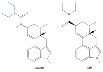 Lisuride, also known as 1,1-diethyl-3-(6-methyl-9,10-didehydroergolin-8α-yl)urea, is an ergoline derivative. It is almost identical in chemical structure to lysergic acid diethylamide (LSD), except that LSD's 8-position carboxamide group has been replaced with a urea group and the 8-position stereochemistry is inverted. Lisuride is described as the free base and as the hydrogen maleate salt.[49][50][51]