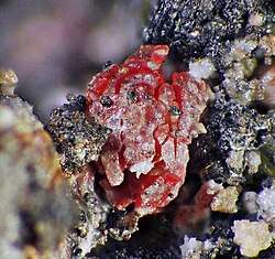 Litharge (from Greek lithargyros, lithos 'stone' + argyros 'silver' λιθάργυρος) is one of the natural mineral forms of lead(II) oxide, PbO. Litharge is a secondary mineral which forms from the oxidation of galena ores. It forms as coatings and encrustations with internal tetragonal crystal structure. It is dimorphous with the yellow orthorhombic form massicot. It forms soft (Mohs hardness of 2), red, greasy-appearing crusts with a very high specific gravity of 9.14–9.35. PbO may be prepared by heating lead metal in air at approximately 600 °C (lead melts at only 300 °C). At this temperature it is also the end product of heating of other lead oxides in air.[5] This is often done with a set of bellows pumping air over molten lead and causing the oxidized product to slip or fall off the top into a receptacle, where it quickly solidifies in minute scales.[6]
