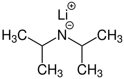 Lithium diisopropylamide (commonly abbreviated LDA) is a chemical compound with the molecular formula LiN(CH(CH3)2)2. It is used as a strong base and has been widely utilized due to its good solubility in non-polar organic solvents and non-nucleophilic nature. It is a colorless solid, but is usually generated and observed only in solution. It was first prepared by Hamell and Levine in 1950 along with several other hindered lithium diorganylamides to effect the deprotonation of esters at the α position without attack of the carbonyl group.[2]