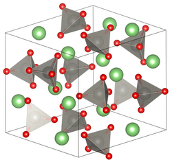 The salt consists of tetrahedrally coordinated Li and W centres bridged by oxides. The W-O and Li-O bond distances are 1.79 and 1.96 Å, respectively. These differing bond lengths reflect the multiple bond character of the W-O interaction and the weaker ionic bonding between the Li-O interactions.[1] The solid undergoes phase transitions at high pressures, such that the coordination geometry at tungsten becomes octahedral (six W-O bonds). For example at 40 kilobars, it adopts a structure related to wolframite.[2]