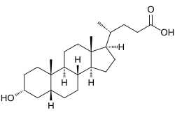 Lithocholic acid, also known as 3α-hydroxy-5β-cholan-24-oic acid or LCA, is a bile acid that acts as a detergent to solubilize fats for absorption. Bacterial action in the colon produces LCA from chenodeoxycholic acid by reduction of the hydroxyl functional group at carbon-7 in the "B" ring of the steroid framework.