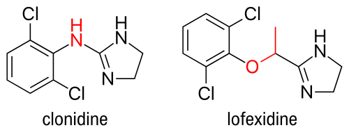 Lofexidine is structurally analogous to clonidine, another α2 adrenergic receptor agonist used for treatment of opioid withdrawal symptoms. A comparison of the two structures is shown at right. Both contain an imidazoline ring and a 2,6-dichlorinated phenyl ring. The differences in structure are shown in red, while the similarities are in black. In addition to the structural differences, administration of lofexidine to people who abuse opioids has been shown to be more effective for a longer duration, with fewer withdrawal symptoms than clonidine even after one day.[23] However, clonidine is often preferred as it is substantially cheaper than lofexidine when purchased with a private (non-NHS) prescription. This factor is exacerbated by the considerable number of and quantities of medications prescribed to alleviate the constellation of withdrawal signs and symptoms. Additionally, clonidine has been shown to significantly lower blood pressure. Therefore, although similar to lofexidine, clonidine is most frequently prescribed to treat high blood pressure.