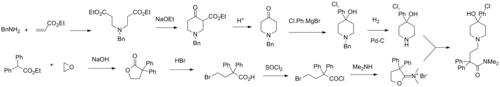 Loperamide is synthesized starting from the lactone 3,3-diphenyldihydrofuran-2(3H)-one and ethyl 4-oxopiperidine-1-carboxylate, on a lab scale.[49] On a large scale a similar synthesis is followed, except that the lactone and piperidinone are produced from cheaper materials rather than purchased.[50][51]