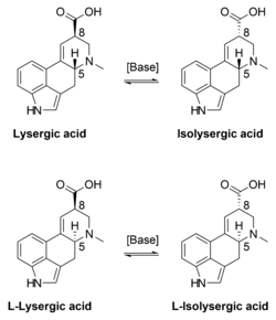 Lysergic acid is a chiral compound with two stereocenters. The isomer with inverted configuration at carbon atom 8 close to the carboxyl group is called isolysergic acid. Inversion at carbon 5 close to the nitrogen atom leads to L-lysergic acid and L-isolysergic acid, respectively.