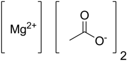Anhydrous magnesium acetate has the chemical formula Mg(CH3COO)2 and in its hydrated form, magnesium acetate tetrahydrate, it has the chemical formula Mg(CH3COO)2·4H2O. In this compound magnesium has an oxidation state of +2. Magnesium acetate is the magnesium salt of acetic acid.[1] It is deliquescent and upon heating, it decomposes to form magnesium oxide.[2] Magnesium acetate is commonly used as a source of magnesium in biological reactions.[3]