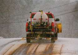 For the purpose of preventing ice from forming on pavement, magnesium chloride is applied in three ways: anti-icing, which involves spreading it on roads to prevent snow from sticking and forming; prewetting, which means a liquid formulation of magnesium chloride is sprayed directly onto salt as it is being spread onto roadway pavement, wetting the salt so that it sticks to the road; and pretreating, when magnesium chloride and salt are mixed together before they are loaded onto trucks and spread onto paved roads. Calcium chloride damages concrete twice as fast as magnesium chloride.[17] The amount of magnesium chloride is supposed to be controlled when it is used for de-icing as it may cause pollution to the environment.[18]