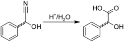 Mandelic acid is usually prepared by the acid-catalysed hydrolysis of mandelonitrile,[8] which is the cyanohydrin of benzaldehyde and can be synthesized in various ways:[9]