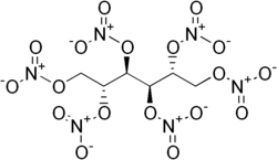 Mannitol hexanitrate is a secondary explosive formed by the nitration of mannitol, a sugar alcohol. The product is used in medicine as a vasodilator and as an explosive in blasting caps. Its sensitivity is high, particularly at high temperatures (> 75 °C) where it is slightly more sensitive than nitroglycerine. Nitromannite is a class B explosive.