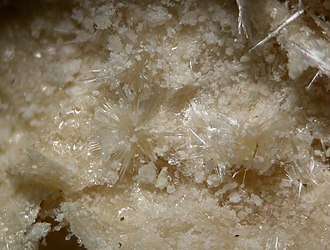 Mascagnite is a rare ammonium sulfate mineral (NH4)2SO4. It crystallizes in the orthorhombic system typically forming as stalactitic masses exhibiting good cleavage. It is soft (not higher than 2.5 on the Mohs scale) and water-soluble. Optical properties are variable; the purest form is transparent and colorless, but opaque gray or yellow deposits are also known.