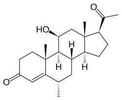 Medrysone (INN, USAN; brand names HMS, Medrocort, others; former developmental code NSC-63278; also known as hydroxymethylprogesterone, methylhydroxyprogesterone, hydroxymesterone, 6α-methyl-11β-hydroxyprogesterone, or 6α-methyl-11β-hydroxypregn-4-ene-3,20-dione) is a synthetic glucocorticoid that is or has been used in the treatment of inflammatory eye diseases.[1][2][3] It has been discontinued in the United States.[4] Although it is very similar in structure to progesterone,[5] neither progestogenic nor androgenic activity has been demonstrated for or attributed to medrysone.[6][7][8]