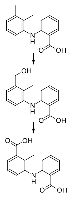 It is metabolized by the liver enzyme CYP2C9 to the only weakly active 3'-hydroxymethylmefenamic acid. 3'-carboxymefenamic acid has also been identified as a metabolite, as well as carboxy glucuronides of all three substances. Mefenamic acid and its metabolites are excreted via the urine (52–67%) and the faeces (20–25%, or less than 20% following another source). The parent substance has a biological half-life of two hours; the half-life of its metabolites may be longer.[7][8][12]