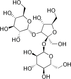 Melezitose, also spelled melicitose, is a nonreducing trisaccharide sugar that is produced by many plant sap eating insects, including aphids such as Cinara pilicornis, by an enzyme reaction. This is beneficial to the insects, as it reduces the stress of osmosis by reducing their own water potential. The melezitose is part of the honeydew which acts as an attractant for ants and also as a food for bees although it is not easily digestible by bees.[1] This is useful to the aphids as they have a symbiotic relationship with ants. Melezitose can be partially hydrolyzed to glucose and turanose the latter of which is an isomer of sucrose.